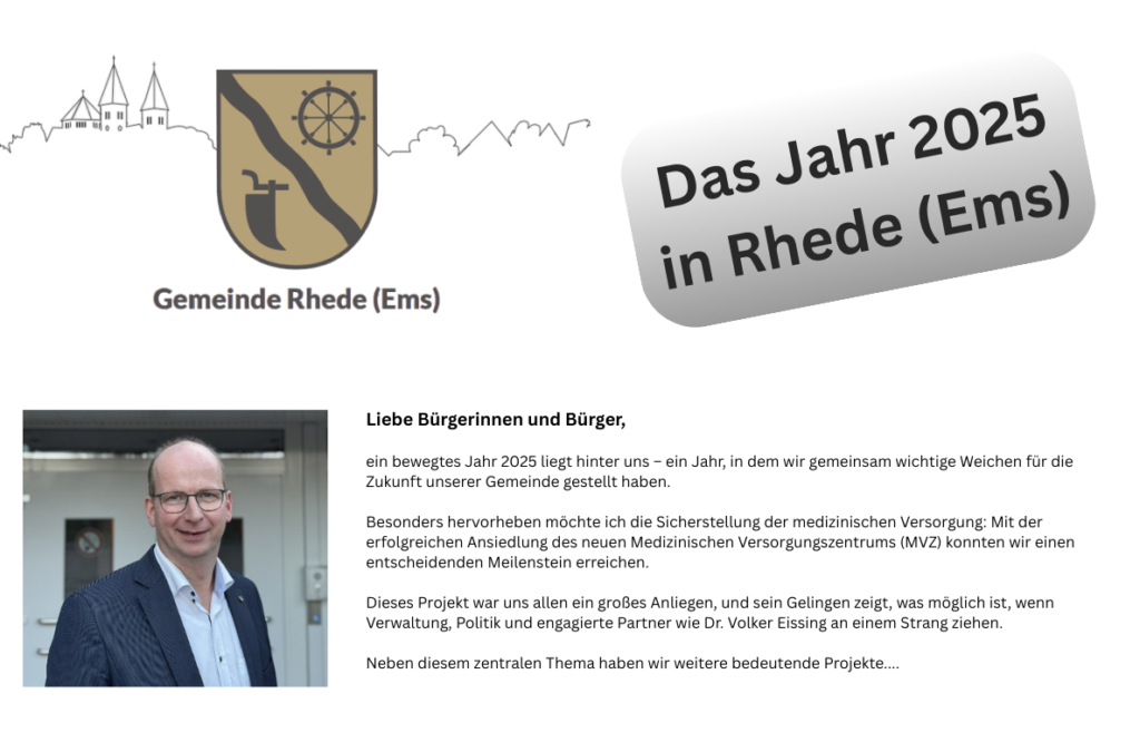 📅 Wann? 08.01.2026 🕖 Uhrzeit? 19:00 Uhr 📍 Wo? Gasthof Vosse-Schepers, Emsstraße 8, 26899 Rhede (Ems) Wir laden alle Bürgerinnen und Bürger herzlich zu unserem Neujahrsempfang ein. Freut euch auf einen gemeinsamen Jahresauftakt, spannende Einblicke und gute...